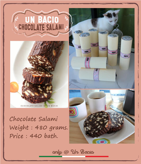 ตัดได้ 10-12 ชิ้นช็อกโกแลตซาลามี่ทำจากช็อกโกแลตแท้ ครีม เนยและไข่สอดไส้ด้วยบิสกิตโฮมเมดแล้วอัดเป็นแท่งเหมือนซาลามี่ช็อกโกแลตซาลามี่เป็นช็อกโกแลตแท้ดังนั้นจึงต้องรักษาอุณหภูมิให้เย็นอยู่เสมอ..การเก็บในตู้เย็นจะทำให้ขนมคงความอร่อย...และการฟรีซในช่องฟรีซเป็นการคงสภาพความอร่อยได้ยาวนานมากยิ่งขึ้นค่ะ