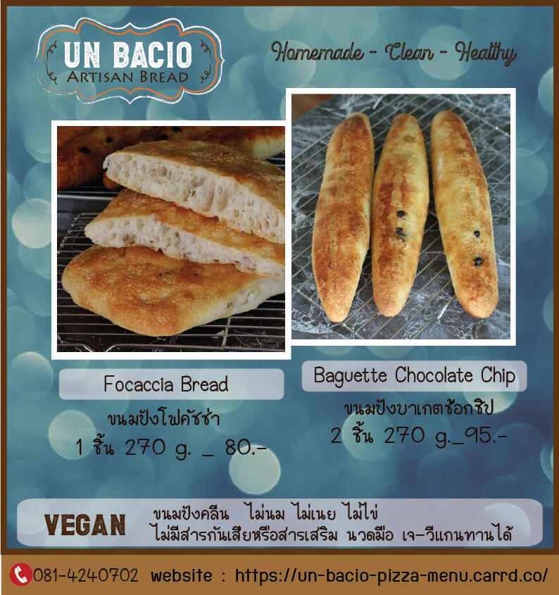 ขนมปังโฟคัชช่า 270 g./ ชิ้น...........80.-6. Baguette Chocolate Chip
